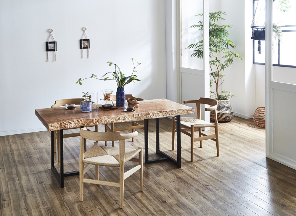 例えば、ダイニングの一枚板テーブルのように、強度と美しさを両立させたい場合は、耐久性があり独特な木目を持つハードメープルが適しています。