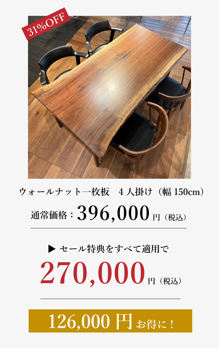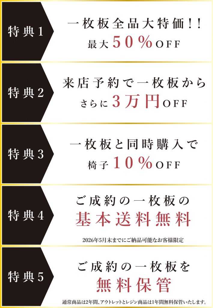 国内最大級の一枚板専門店ならではのメリットはそのままに、最高にお得なこの1ヶ月をお見逃しなく。