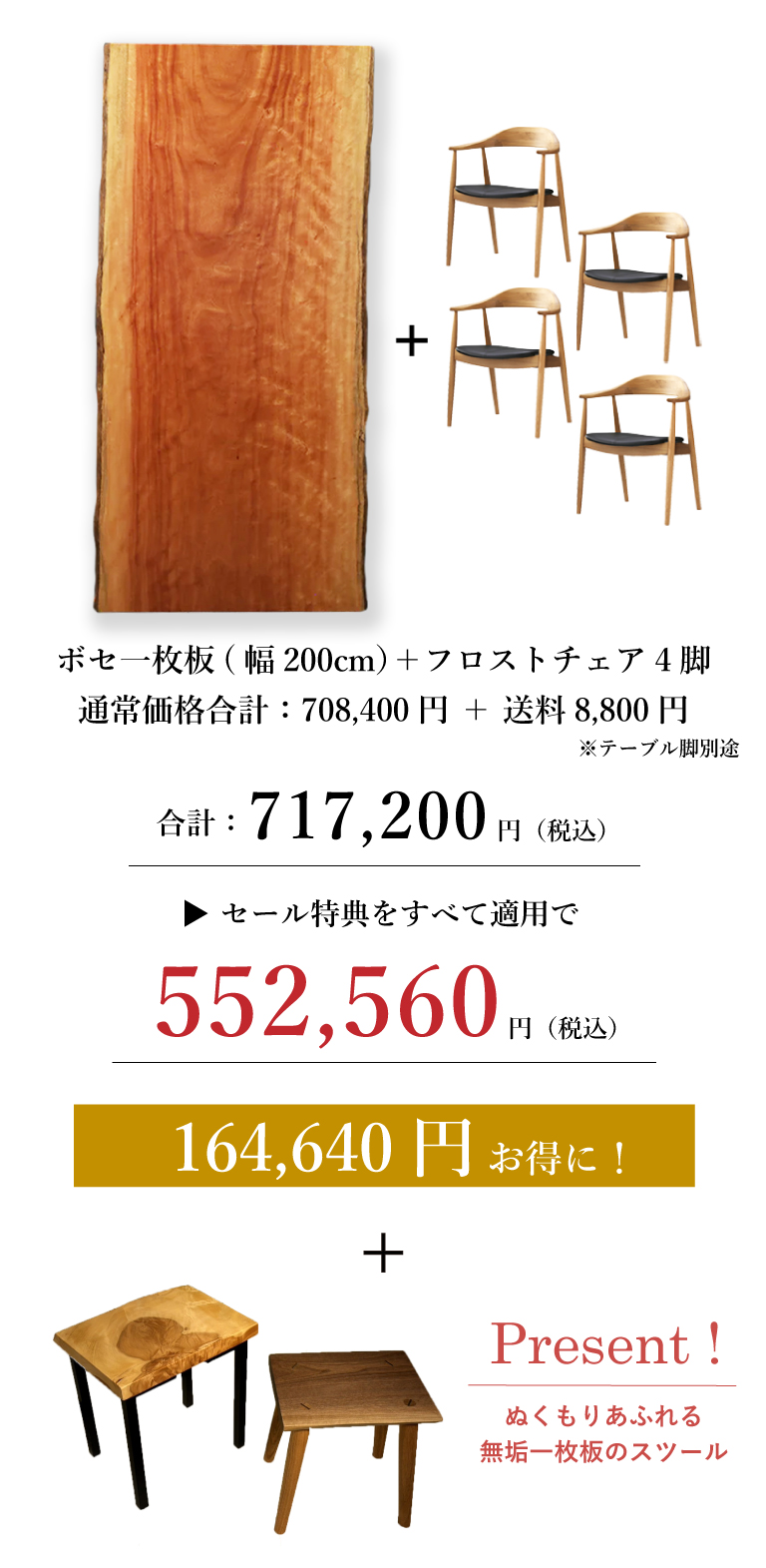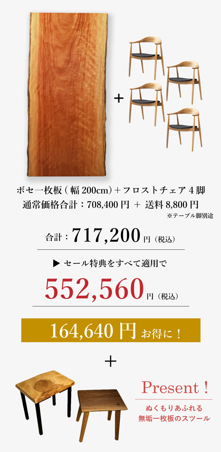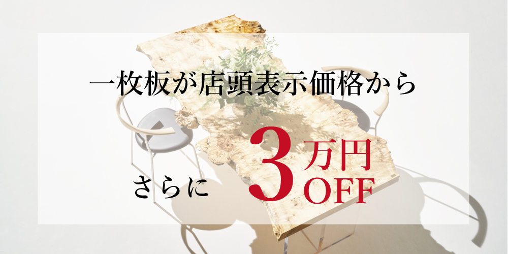 セール期間中は特価一枚板をご用意する他、お得な特典を多数ご用意しております。